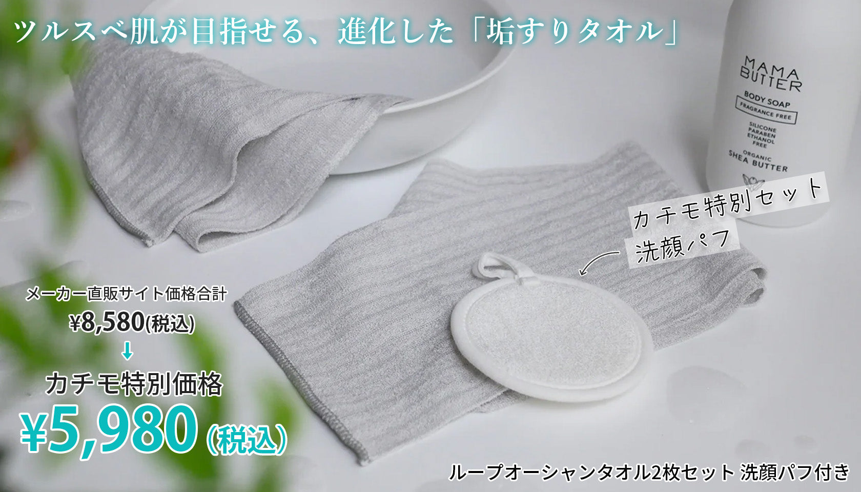 ループオーシャンタオル2枚セット 洗顔パフ付き