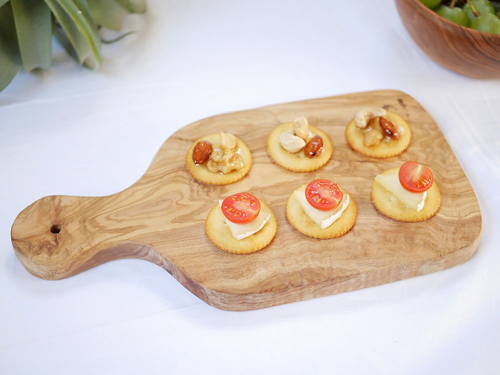 オードブルやオープンサンド、 お菓子をアレンジして食卓へ。オリーブの木目がアクセントになって食卓が華やかな雰囲気になりますよね。