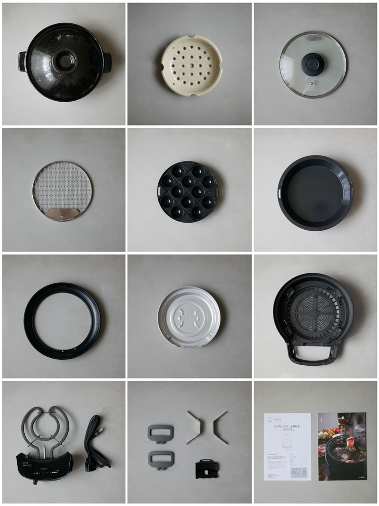 | セット内容 | 【本体のみ】 本体、深皿、ボールプレート、焼き網、ふた、取っ手(プレート交換用)、焼き網/土鍋アタッチメント、電源コード、レシピブック、取扱説明書(保証書) 【本体+土鍋セット】 本体、深皿、ボールプレート、焼き網、土鍋(長谷製陶製)・蒸し皿、ふた、取っ手(プレート交換用)、焼き網/土鍋アタッチメント、電源コード、レシピブック、取扱説明書(保証書) |